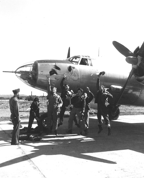 "Yippee: It's all over" A 1st TAC crew that led the last flight on the group's last mission against enemy positions on the Ile D'Oleron off the west coast of France receive the first word of Germany's capitulation. They jumped with glee when the news was brought to them by 1st. Lt. Michael J. Costello (extreme left). L. to R. are: 1st. Lt. Jones Spann, Capt. Russell G. Ested, 1st. Lt. James N. Childs, T/Sgt. Pete J. Morrow, S/Sgt. William L. Spencer.